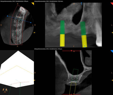 Durch die Anwendung der 3D Volumentomographie ist eine radiologische Simulation und eine sehr genaue Planung der Behandlungsergebnisse möglich. Das Knochenangebot wird präzise vermessen und das optimal passende Implantat kann ausgewählt werden. Im Fall eines Knochendefizites können verschiedene Methoden zum Aufbau verwendet werden. Hierfür wird Eigenknochen aber auch Knochenersatzmaterial eingesetzt.